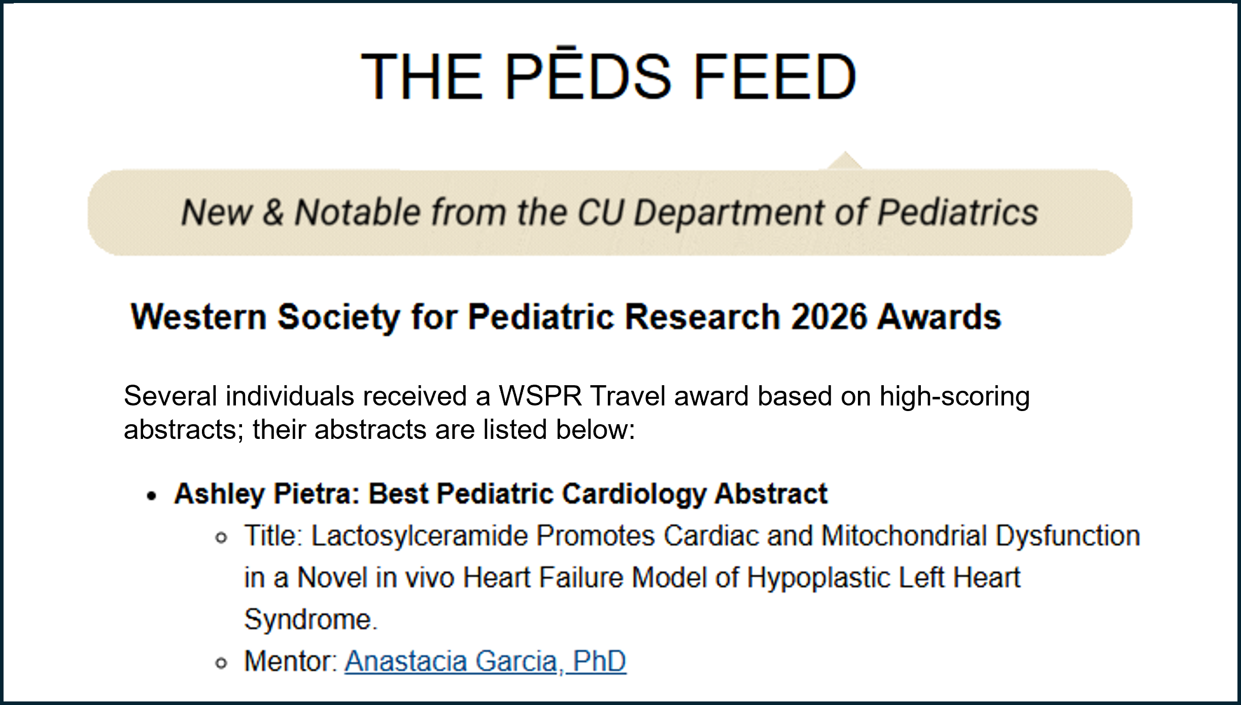 Ashely Pietra (MS2) made it into the Peds Feed Newsletter! Congratulations Ashley on receiving the Western Society for Pediatric Research Best Pediatric Cardiology Abstract Award ! She will be giving her oral presentation in Carmel, California next week! Cheers to a fantastic start to 2026!